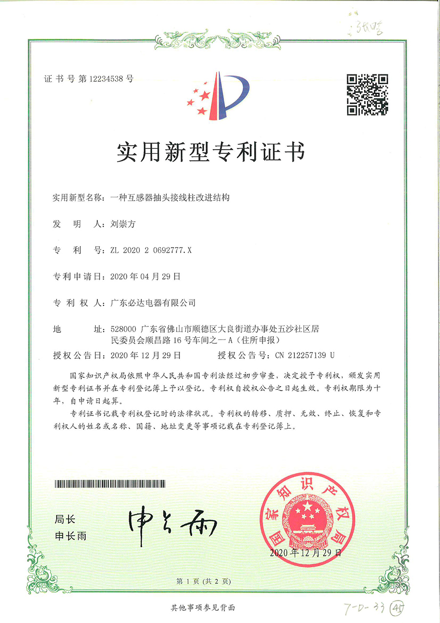 45.一种互感器抽头接线柱改进结构-实用新型专利证书(ZL 2020 2 0692777.X)2020.04.29